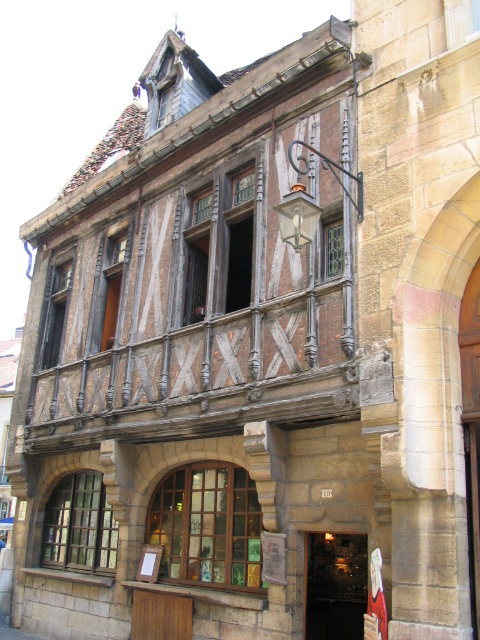 ![]() Les parties entre chaque "pans de bois" ont été ouvragée. Remarquez aussi les corbeaux en pierre de taille qui soutiennent l'étage qui fait pignon sur rue.. |