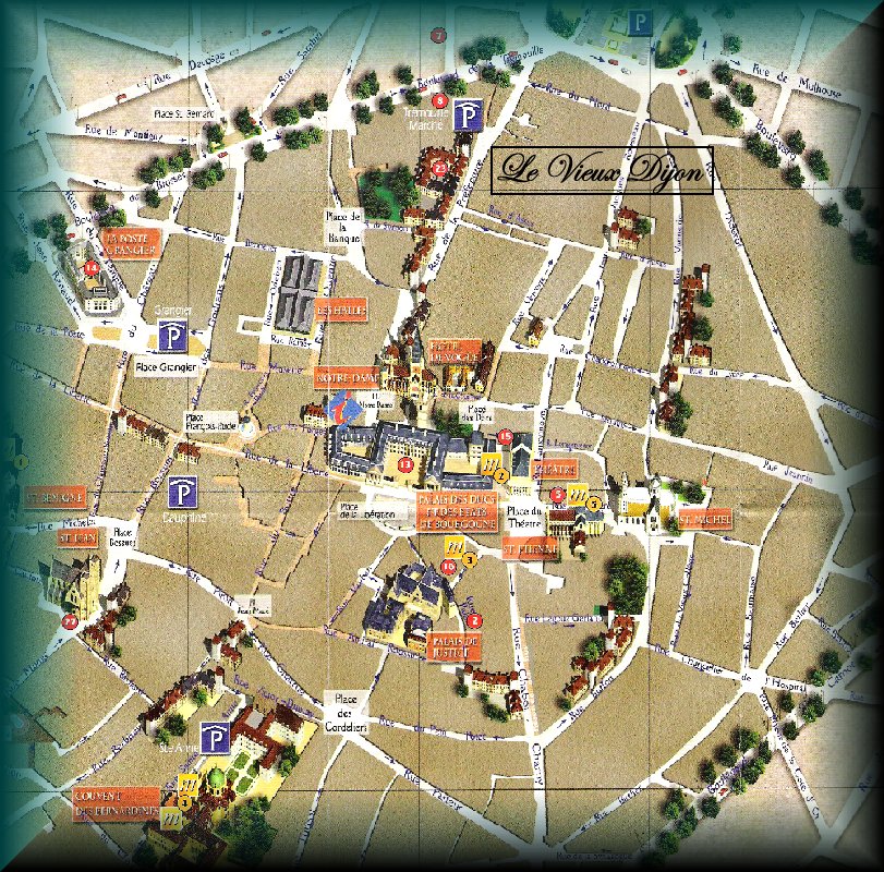 Capitale des Ducs de Bourgognes pendant des siècles, la ville est maintenant vistéepar des milliers de touristes. J'ai profité d'un passage éclair pendant mes vacances pour vous rapporter quelques documents photographiques ainsi que le plan illustré. Pour obtenir le nom de certains bâtiments sur la plan joint il vous suffit de promener votre souris sur les dessins représentatifs et une petite légende apparaîtra. Dans l'angle de deux murs de l'église Notre-Dame a été gravé une chouette, chaque personne connaissant la coutume carresse cette chouette afin qu'elle lui donne du bonheur. Je l'ai carressé, j'espère que j'aurai encore plus de bonheur que d'habitude. Si vous passez par la Bourgogne, faite une petite halte chez les Dijonais, vous ne serez pas déçu. ![]() |
